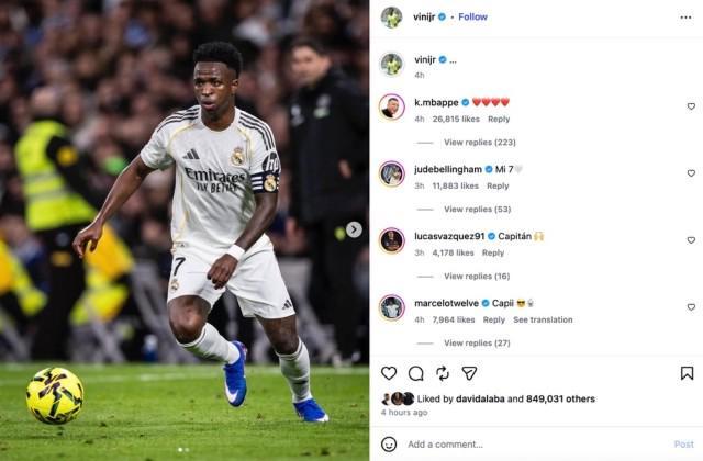 皇马年末主场收官战2比0塞维利亚,全队表现一般,失误连连。由于巴尔韦德伤缺,本场维尼修斯戴上队长袖标。不过熊队表现平庸,伯纳乌球迷对他嘘声连连。赛后维尼修斯在社媒发了自己戴着皇马队长袖标的照片,配文是通常代表无语的“…”。值得注意的是,他同时把自己的头像换成了自己身穿巴西队球衣的照片。不过队友们纷纷在评论区点赞,对他表示支持。而赛后阿隆索被问到为什么维尼修斯被嘘时,皇马教头的回答耐人寻味:“球迷有自由表达自己的观点。”