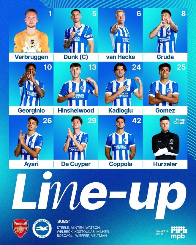 布莱顿首发:1-费布鲁亨、29-德克伊珀、5-邓克、6-范黑克、24-卡迪奥卢、42-科波拉、13-欣谢尔伍德、8-格鲁达、25-迭戈-戈麦斯、26-阿亚里、10-吕特